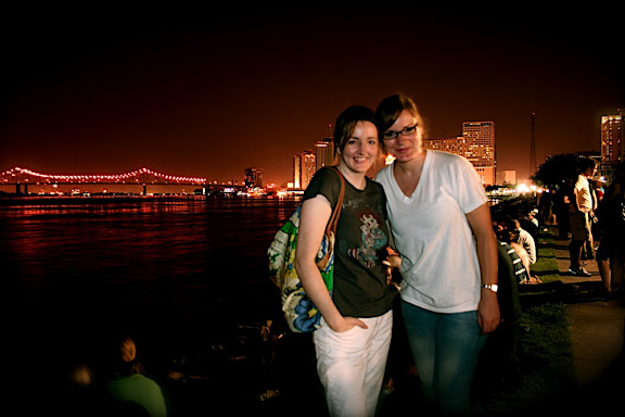 Isaac and I pulled up about 45 minutes late to pick Brie up from the airport. I still really wanted to try to make it to the fireworks on the river, so even though it was now past 8, I drove a fast 50 mph on the spare tire back to the Quarter, hunted around for a while for parking, found parking, borrowed shoes from Brie because of the flip flop debacle, walked to the apartment, sprayed on poisonous amounts of OFF, grabbed a tripod, and we set off down to the river to see the fireworks. The fireworks started when we were only a couple of blocks from the apartment and stopped when we were a block from the river. So, this is what they looked like to us: